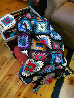 Brukte vel en halv kasse med restegarn og da er det langt over en kasse igjen. For ikke å snakke om alt jeg har hjemme. Fant brunt gammelt garn som neste skal hekles sammen med.